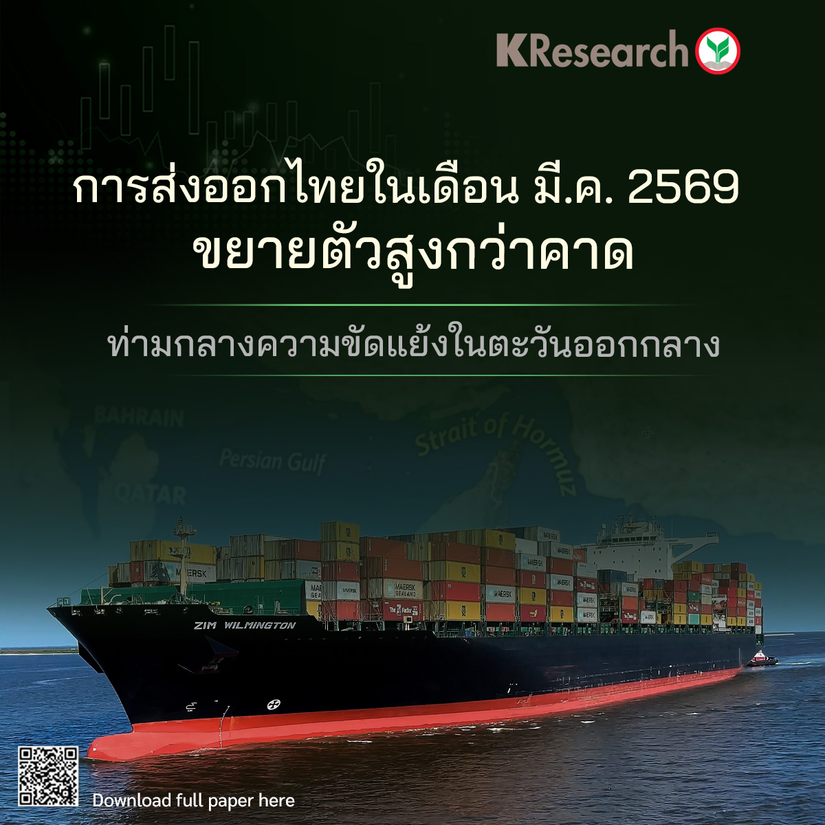 การส่งออกไทยในเดือน มี.ค. 2569 ขยายตัวสูงกว่าคาดท่ามกลางความขัดแย้งในตะวันออกกลาง (ศูนย์วิจัยกสิกรไทย)