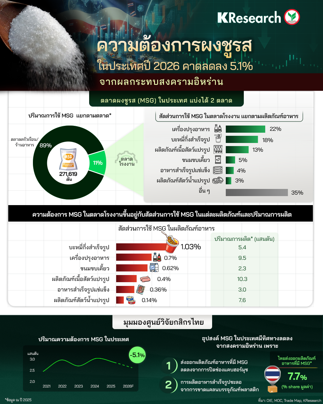 ความต้องการผงชูรสในประเทศปี 2026 คาดลดลง 5.1% จากผลกระทบสงครามอิหร่าน (ศูนย์วิจัยกสิกรไทย Infographic)