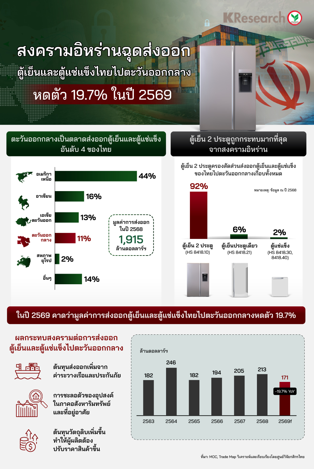 สงครามอิหร่านฉุดส่งออกตู้เย็นและตู้แช่แข็งไทยไปตะวันออกกลางหดตัว 19.7% ในปี 2569 (ศูนย์วิจัยกสิกรไทย Infographic)