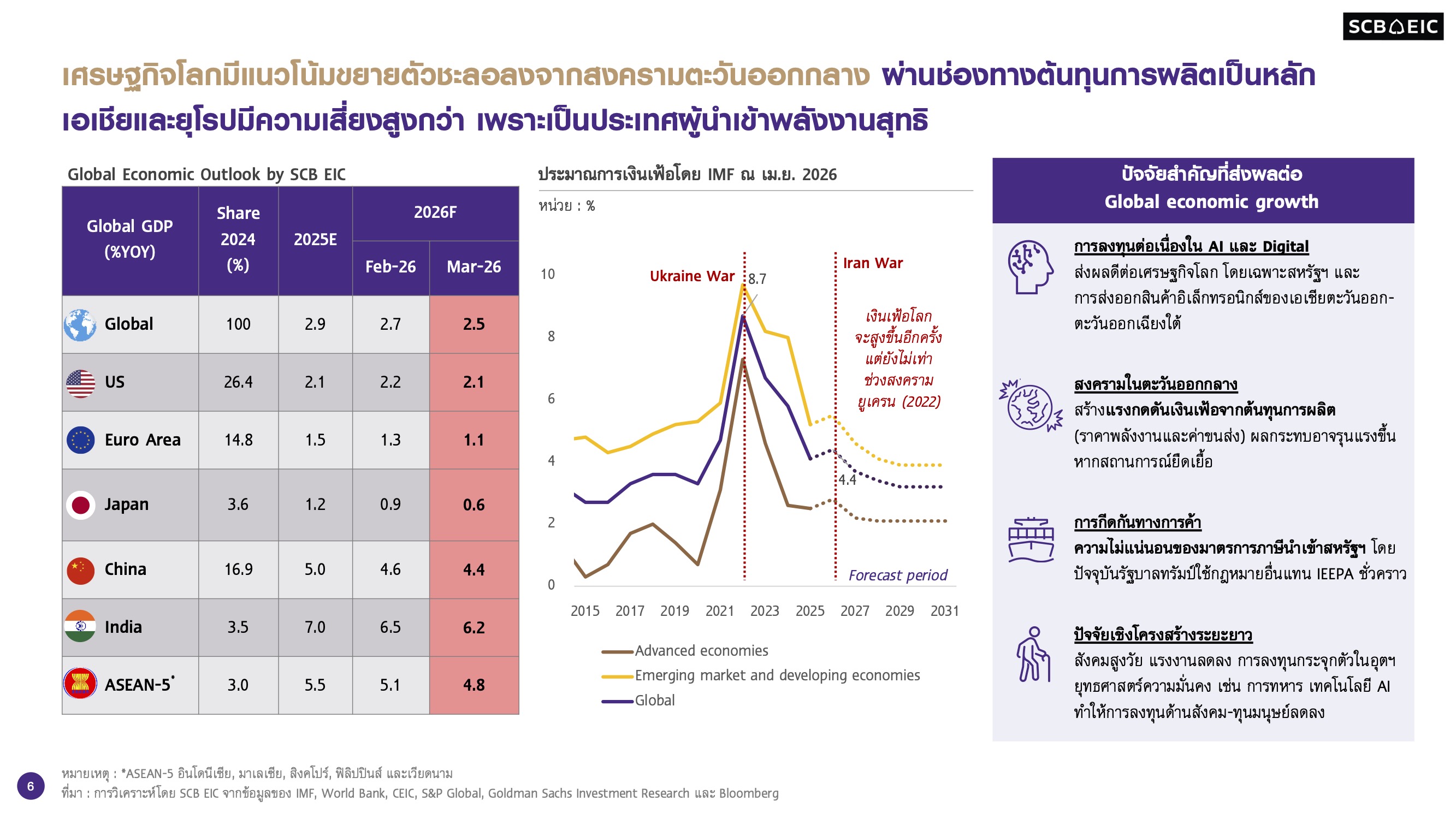 SCB EIC ประเมินเศรษฐกิจโลกปี 2569 จะขยายตัวชะลอลงมาอยู่ที่ 2.5% จาก 2.9% ในปี 2568 โดยได้รับแรงกดดันจากความขัดแย้งในตะวันออกกลาง ผ่านต้นทุนพลังงานและวัตถุดิบที่สูงขึ้น เศรษฐกิจสหรัฐฯ มีแนวโน้มชะลอลงตามการจ้างงานภาคเอกชนที่อยู่ในระดับต่ำ ความเชื่อมั่นผู้บริโภคที่ปรับลดลง เศรษฐกิจยูโรโซน ชะลอลงจากภาคการผลิต แม้ผลกระทบจะยังจำกัดกว่าช่วงสงครามรัสเซีย-ยูเครนในปี 2565 เศรษฐกิจจีน ได้รับผลกระทบจากความขัดแย้งในตะวันออกกลางค่อนข้างจำกัด เนื่องจากมีความมั่นคงทางพลังงานสูง แต่ยังมีแนวโน้มชะลอลงจากอุปสงค์ในประเทศที่ซบเซา เศรษฐกิจญี่ปุ่น ได้รับแรงหนุนจากการบริโภคและการลงทุนในช่วงต้นปี อย่างไรก็ดี ความเสี่ยงการขาดแคลนวัตถุดิบอาจเริ่มกดดันภาคการผลิตในระยะถัดไป