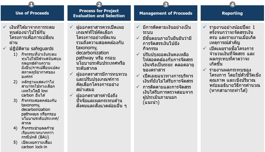 * ผู้ระดมทุนปฏิบัติตามมาตรการป้องกัน (safeguards) ที่ ICMA ระบุไว้ทั้งหมด 5 ข้อเพื่อเป็นการยืนยันความน่าเชื่อถือของการดำเนินงานเพื่อการเปลี่ยนผ่าน