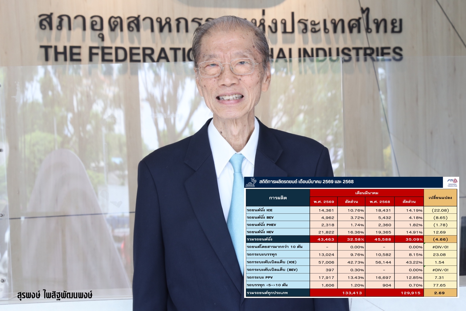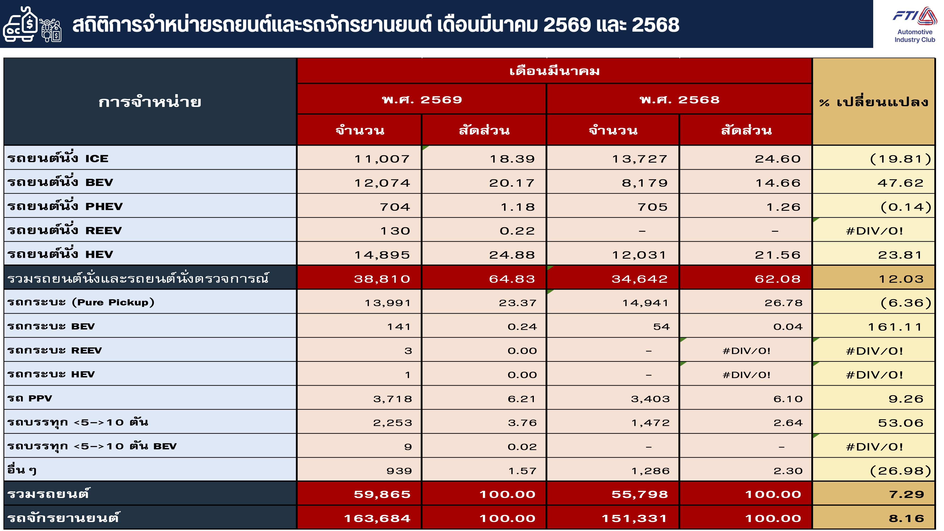 ยอดขายรถยนต์ภายในประเทศของเดือนมีนาคม 2569 มีจำนวนทั้งสิ้น 59,865 คัน เพิ่มขึ้นจากเดือนกุมภาพันธ์ 2569 ร้อยละ 24.09 และเพิ่มขึ้นจากเดือนมีนาคม 2568 ร้อยละ 7.29 เพิ่มขึ้นจากการส่งมอบรถยนต์ที่จองกว่าหนึ่งแสนคันในงานบางกอก อินเตอร์เนชั่นแนล มอเตอร์ โชว์ปลายเดือนมีนาคมถึงต้นเดือนเมษายนโดยเฉพาะรถยนต์ไฟฟ้าที่มียอดจองกว่าร้อยละห้าสิบของยอดจอง รวมทั้งรถกระบะดัดแปลง PPV ที่มีบริษัทหนึ่งได้ออกใหม่ช่วงกลางปีที่แล้ว จึงไม่มียอดขายในเดือนมีนาคมปีที่แล้ว อย่างไรก็ตามรถกระบะก็ยังขายลดลงร้อยละ 6.36 จากมีนาคมปีก่อนจากการเข้มงวดปล่อยสินเชื่อของสถาบันการเงินเพราะเศรษฐกิจของประเทศเติบโตในอัตราต่ำ รายได้ของผู้ซื้ออาจจะไม่สามารถชำระค่างวดได้ครบทุกงวด จึงขอให้รัฐบาลใหม่รีบเสนอนโยบายและงบประมาณรายจ่ายประจำปี 2670 ต่อรัฐสถาโดยเร็วเพื่อจะได้ลงทุนในโครงการต่าง ๆ ได้เร็วขึ้น รวมทั้งสร้างความเชื่อมั่นให้นักลงทุนในประเทศและนักลงทุนต่างประเทศลงทุนในโครงการต่าง ๆ ได้เร็วขึ้นเพื่อสร้างงานสร้างรายได้คนไทยมากขึ้น เศรษฐกิจไทยจะได้เติบโตไล่เรี่ยกับประเทศเพื่อนบ้าน เมื่อเศรษฐกิจของประเทศเติบโตในอัตราสูงก็ยิ่งสร้างความเชื่อมั่นให้นักลงทุนต่างประเทศและในประเทศลงทุนมากขึ้นเป็นวัฏจักรเศรษฐกิจเติบโตในอัตราสูงตลอดไปจนประเทศไทยหลุดพ้นจากประเทศรายได้ปานกลางเสียที ต้องกระตุ้นอุตสาหกรรมที่มีห่วงโซ่อุปทานมาก มีแรงงานจำนวนมากผลิตสินค้ามากขึ้นจากปีที่ผ่านมา ดัชนีผลผลิตอุตสาหกรรมจะได้เติบโตเลขสองหลัก ใช้กำลังการผลิตมากกว่าร้อยละ 70 ของกำลังการผลิตทั้งหมด จะได้มีการลงทุนจ้างงานให้คนไทยมีงานทำมากขึ้น
