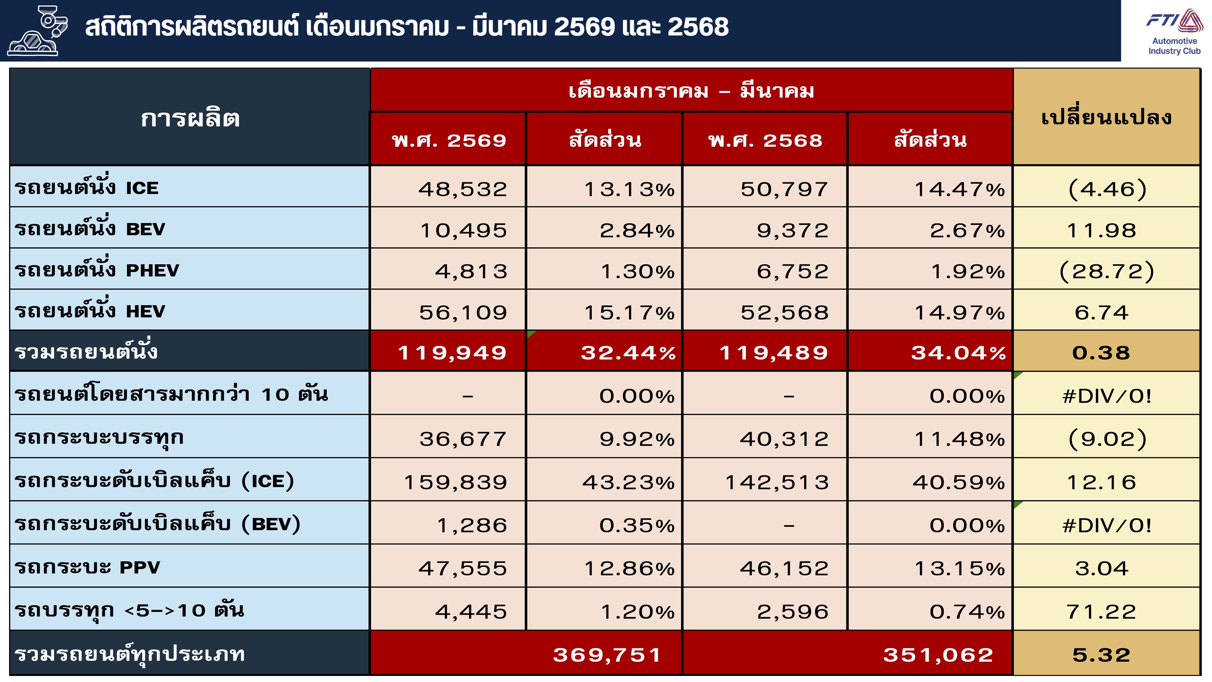 จำนวนรถยนต์ที่ผลิตได้ในเดือนมกราคม - มีนาคม 2569 มีจำนวนทั้งสิ้น 369,751 คัน เพิ่มขึ้นจากเดือนมกราคม - มีนาคม 2568 ร้อยละ 5.32