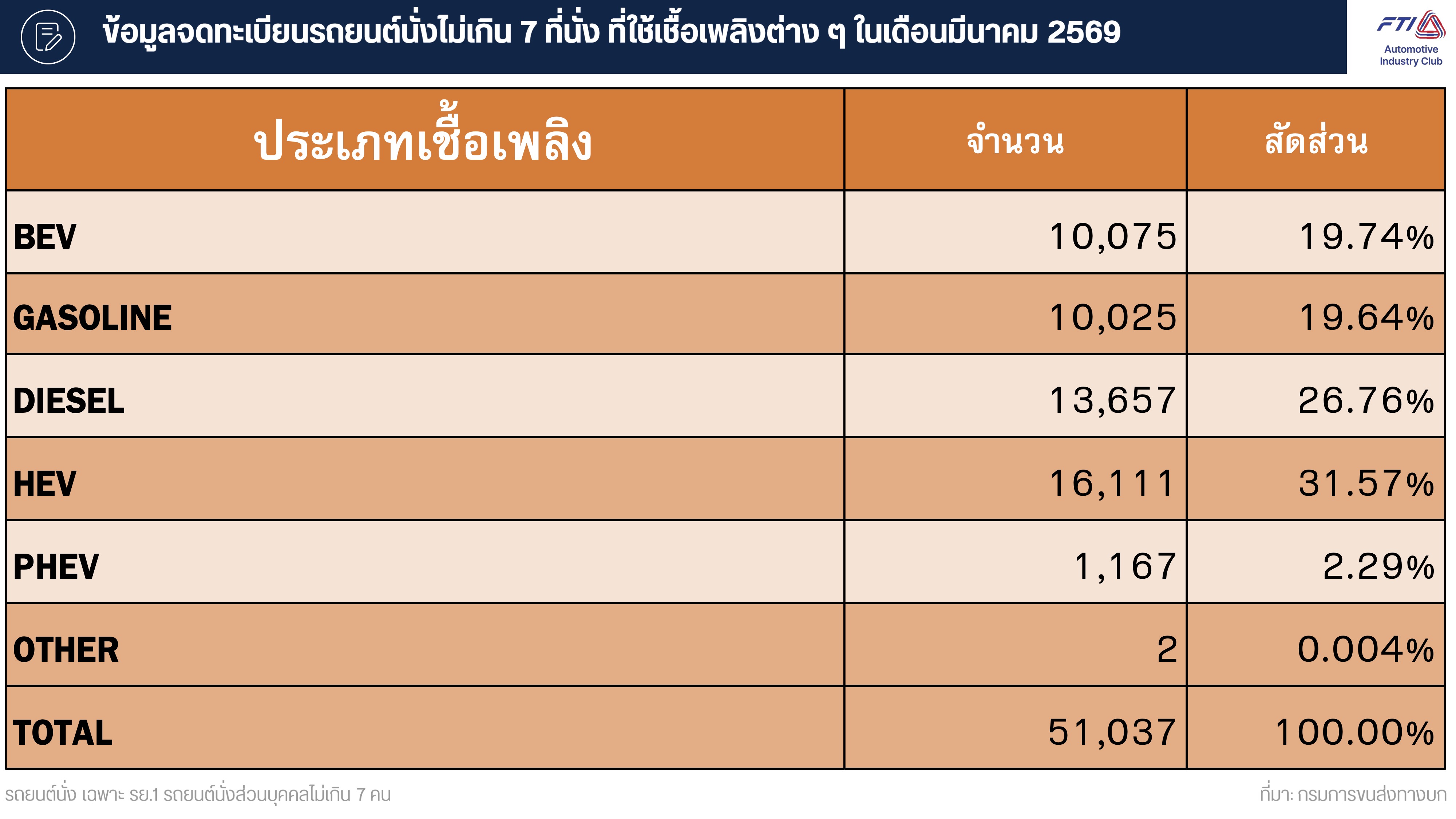 ยานยนต์ไฟฟ้าป้ายแดงประเภท HEV เดือนมีนาคม 2569