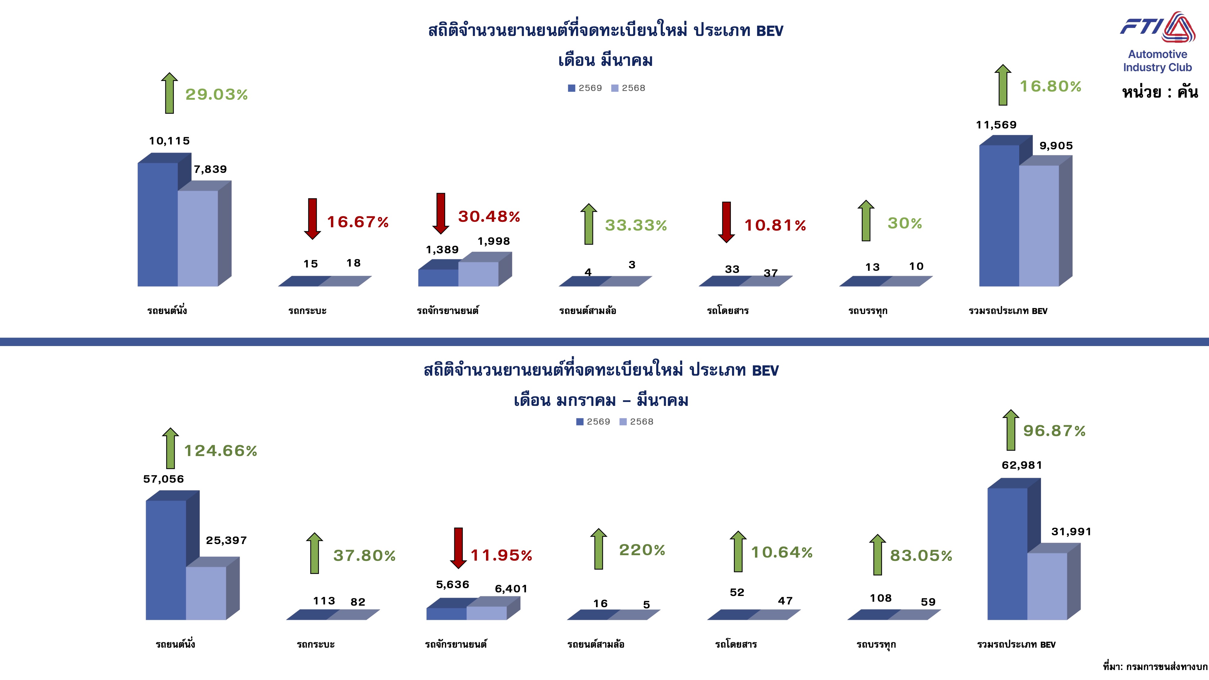 เดือนมีนาคม 2569 มียานยนต์ประเภทไฟฟ้า (BEV) จดทะเบียนใหม่มีจำนวน 11,569 คัน เพิ่มขึ้นจากเดือนมีนาคมปีที่แล้วร้อยละ 16.80 โดยแบ่งเป็น