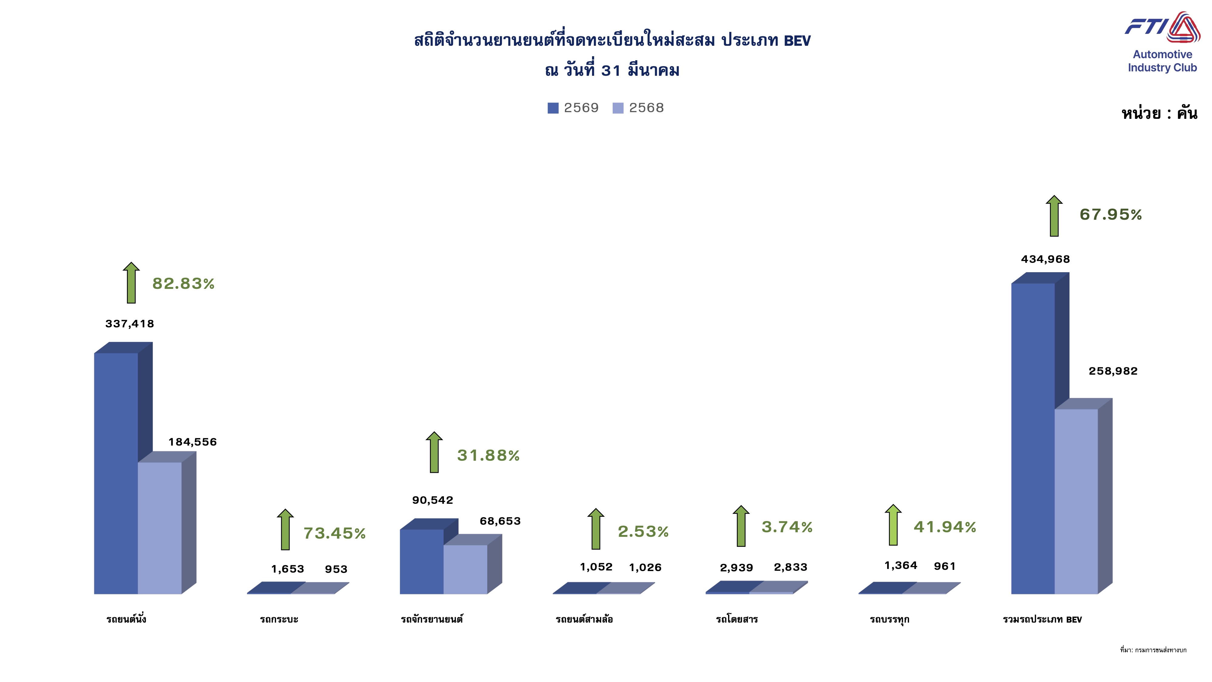 ณ วันที่ 31 มีนาคม 2569 ยานยนต์ไฟฟ้าจดทะเบียนสะสมประเภท BEV มีจำนวนทั้งสิ้น 434,968 คัน เพิ่มขึ้นจากปีที่แล้วร้อยละ 67.95 โดยแบ่งประเภทได้ ดังนี้