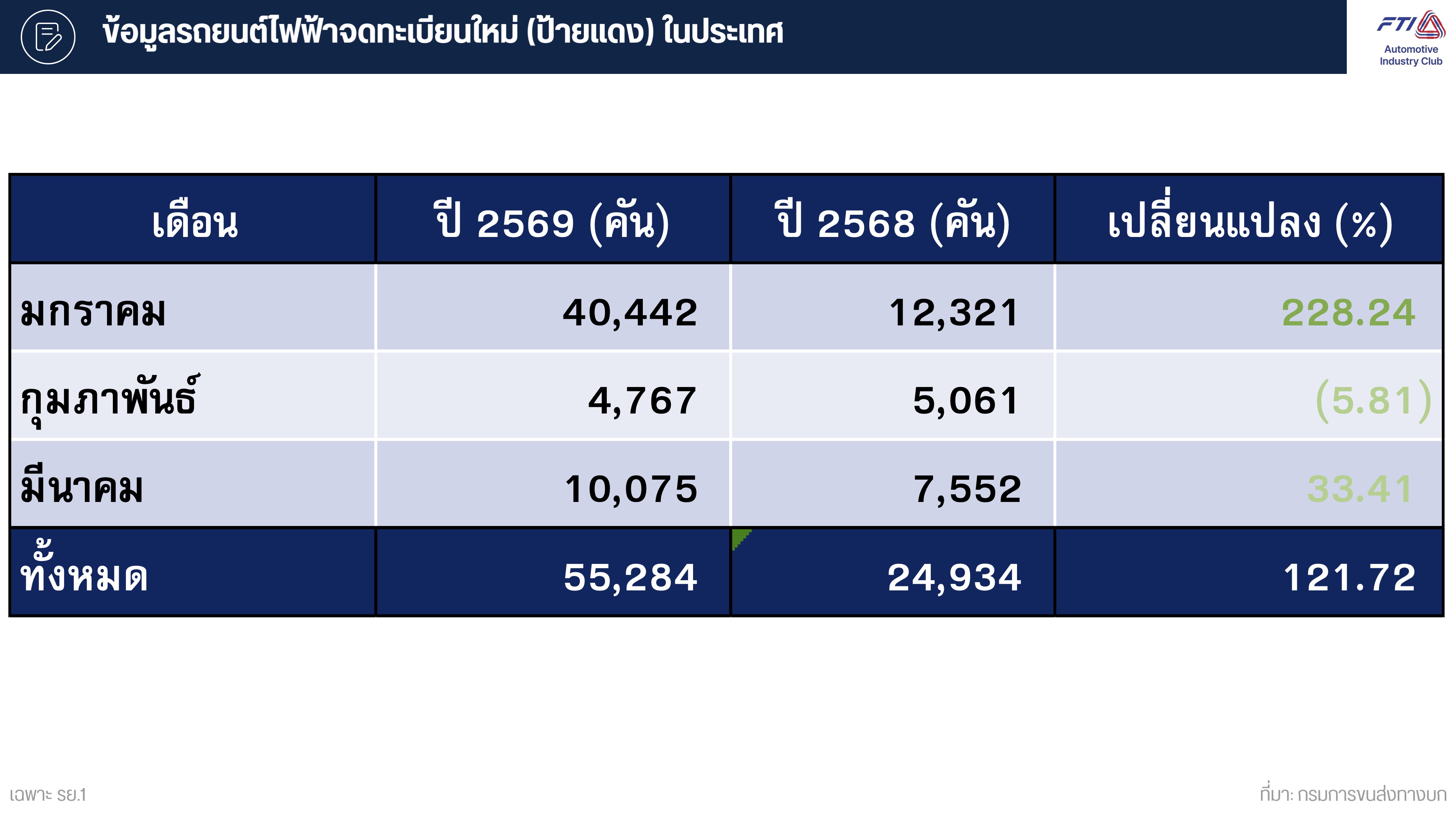 ยานยนต์ไฟฟ้าป้ายแดงประเภท BEV เดือนมีนาคม 2569