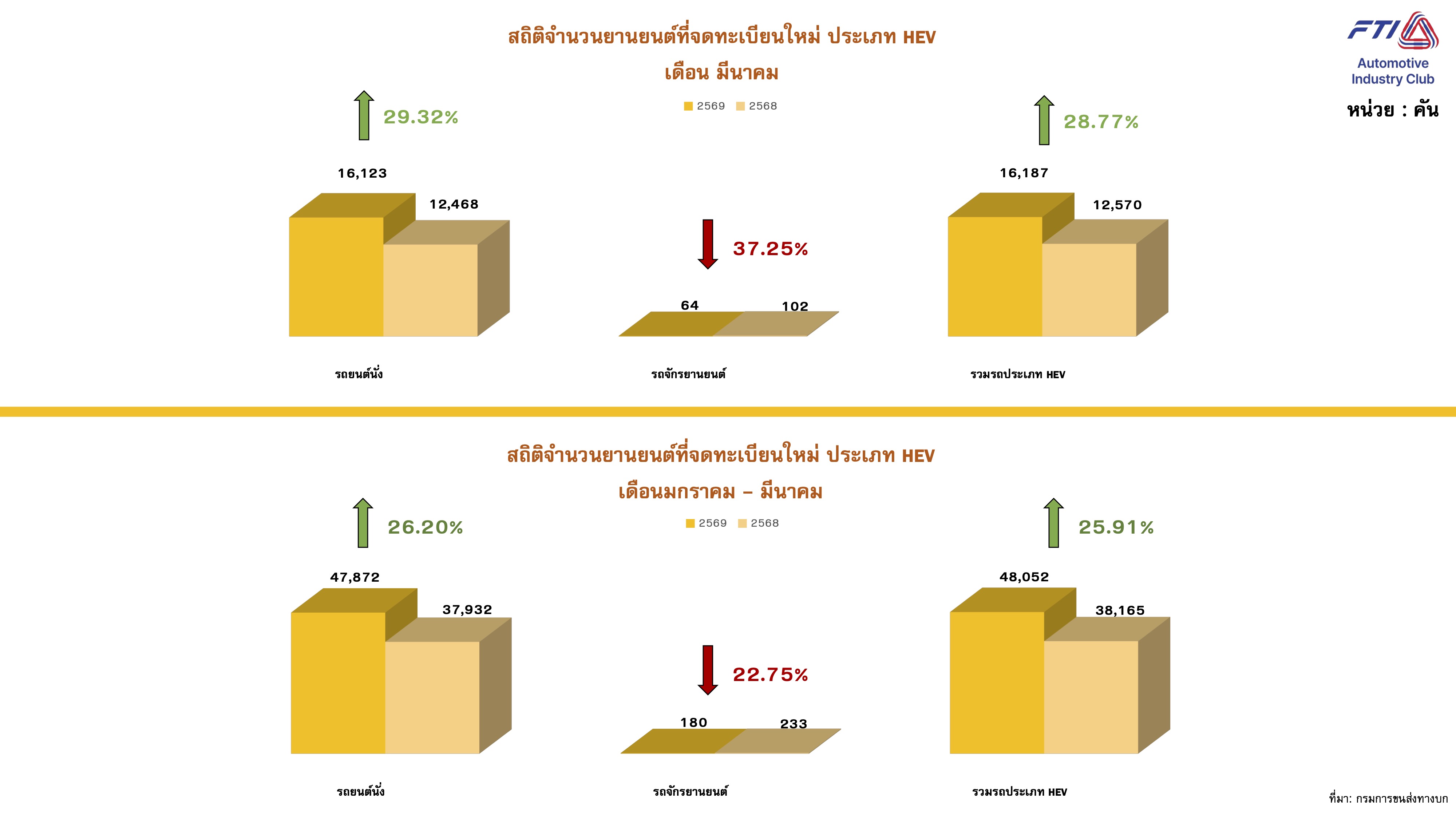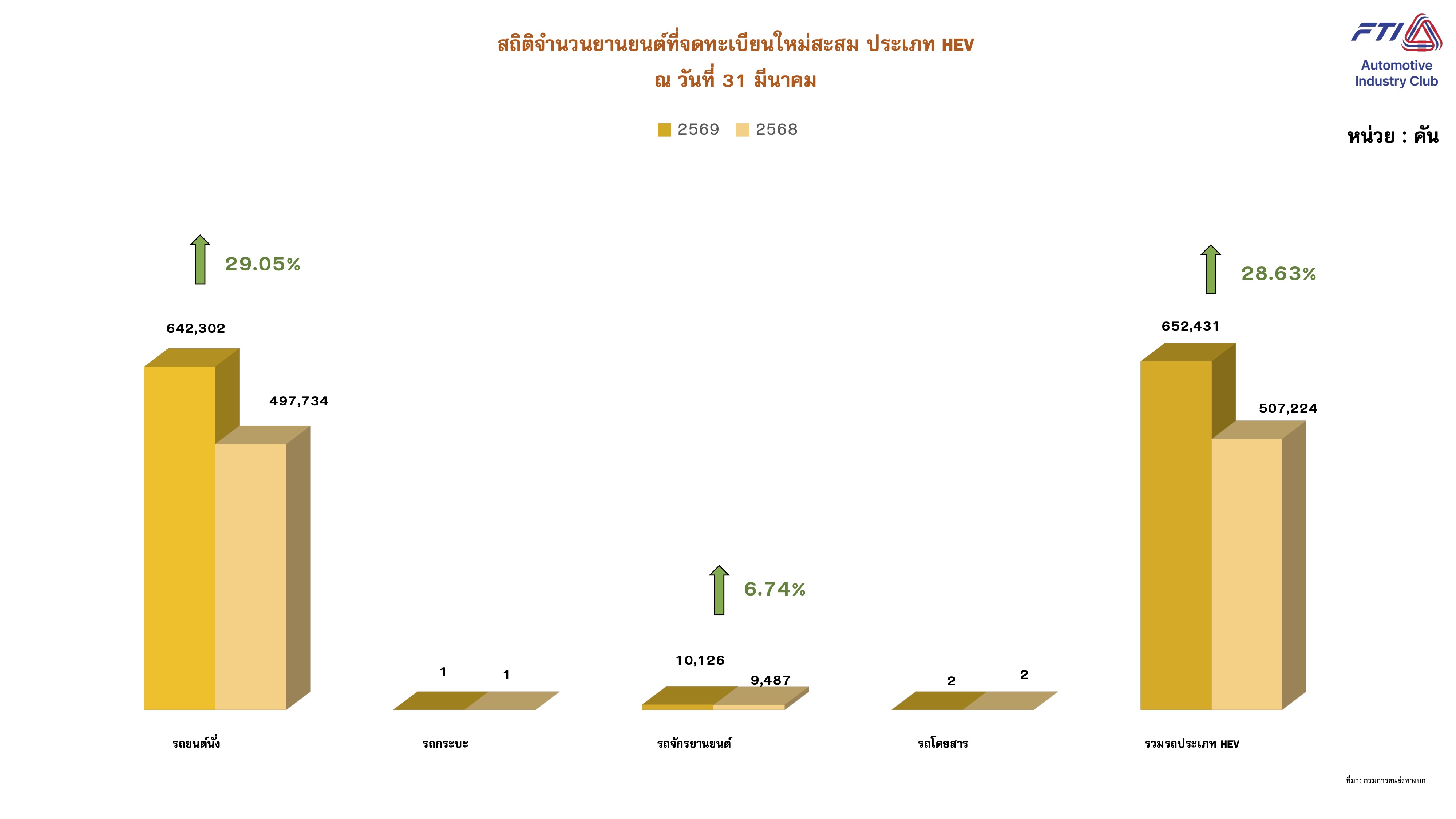 เดือนมีนาคม 2569 มียานยนต์ประเภทไฟฟ้า (HEV) จดทะเบียนใหม่มีจำนวน 16,187 คัน เพิ่มขึ้นจากเดือนมีนาคมปีที่แล้วร้อยละ 28.77 โดยแบ่งเป็น