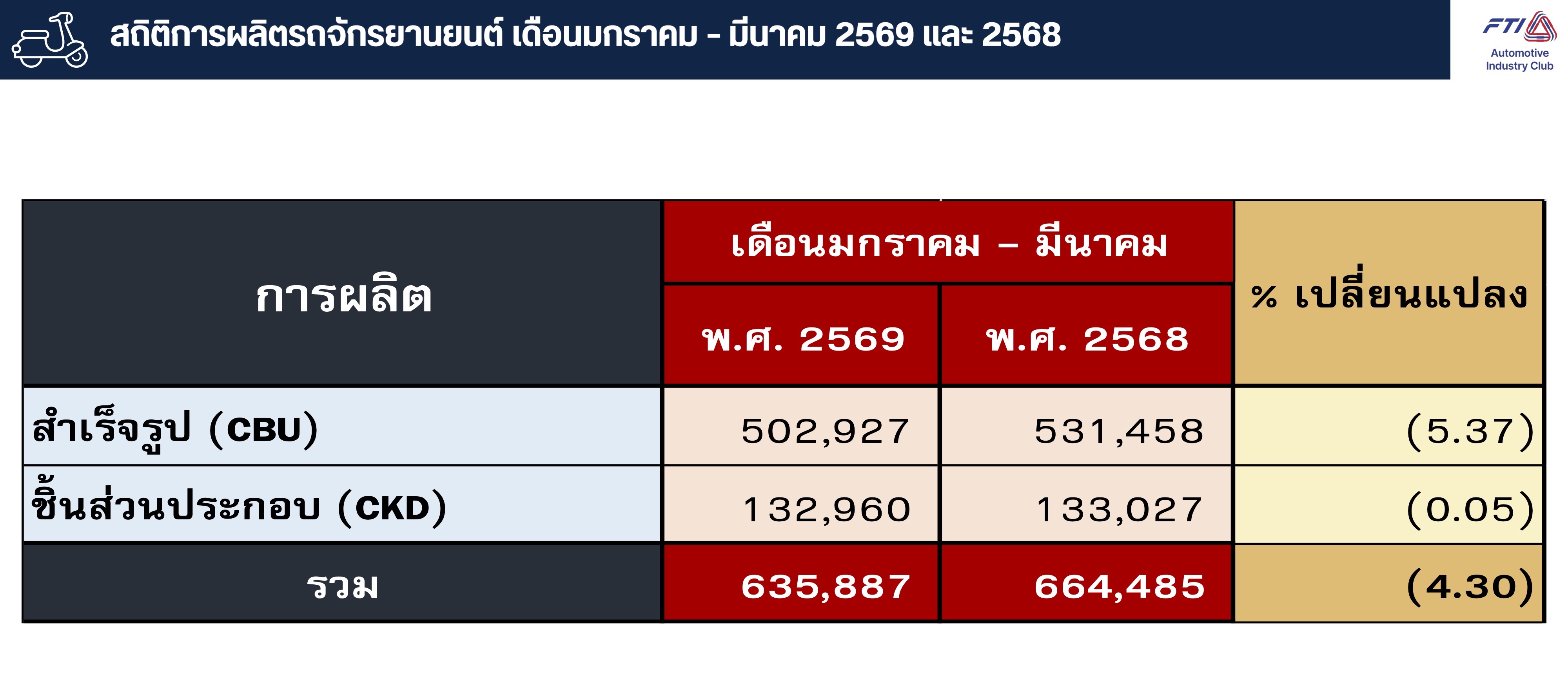 ยอดการผลิตรถจักรยานยนต์เดือนมกราคม – มีนาคม 2569 มีจำนวนทั้งสิ้น 635,887 คัน ลดลงจากปี 2568 ร้อยละ 4.30 โดยแยกเป็นรถจักรยานยนต์สำเร็จรูป (CBU) 502,927 คัน ลดลงจากปี 2568 ร้อยละ 5.37 และชิ้นส่วนประกอบรถจักรยานยนต์ (CKD) 132,960 คัน ลดลงจากปี 2568 ร้อยละ 0.05