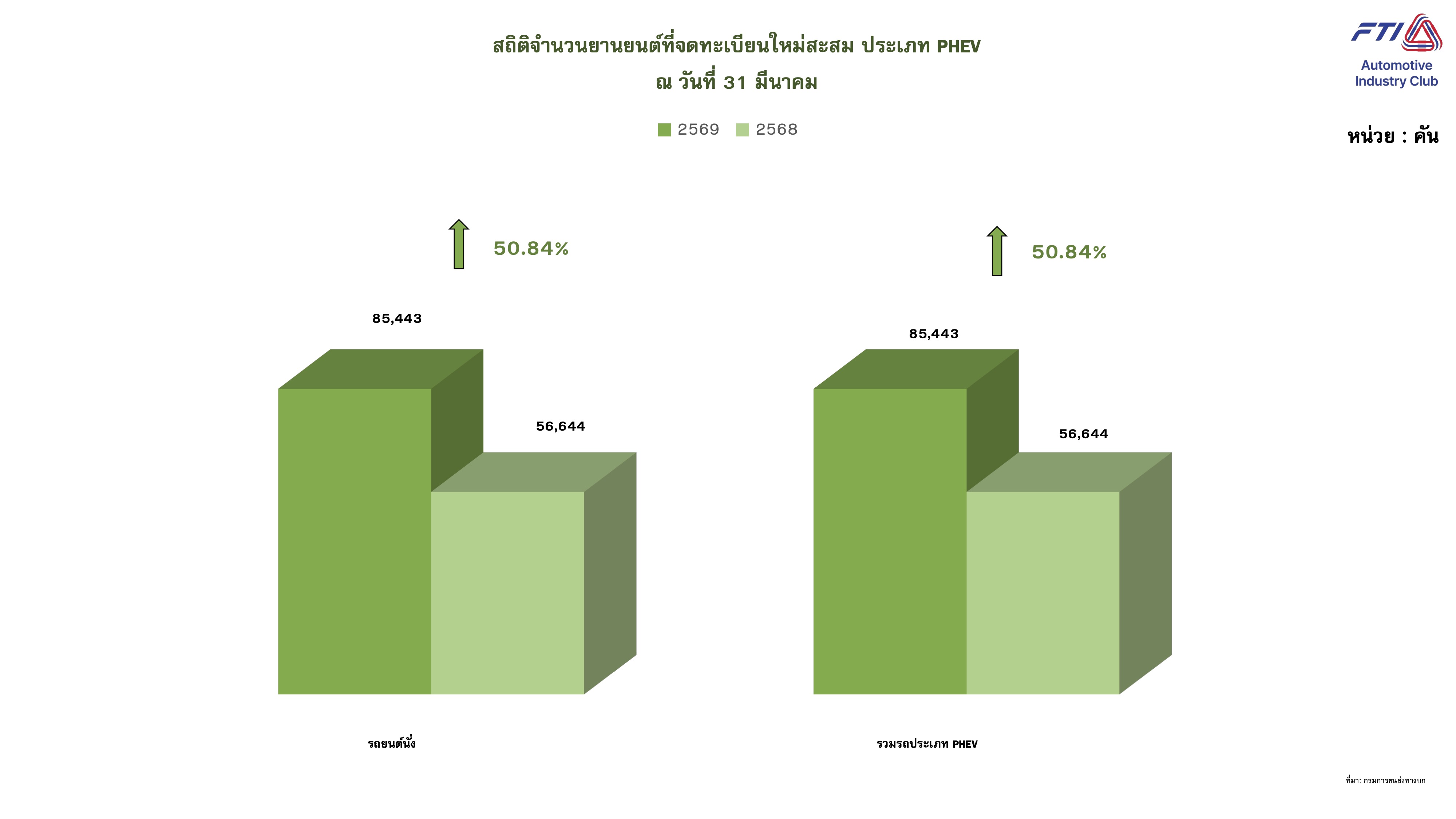 ณ วันที่ 31 มีนาคม 2569 ยานยนต์ไฟฟ้าจดทะเบียนสะสมประเภท PHEV มีจำนวนทั้งสิ้น 85,443 คัน เพิ่มขึ้นจากปีที่แล้วร้อยละ 50.84 โดยแบ่งประเภทได้ ดังนี้