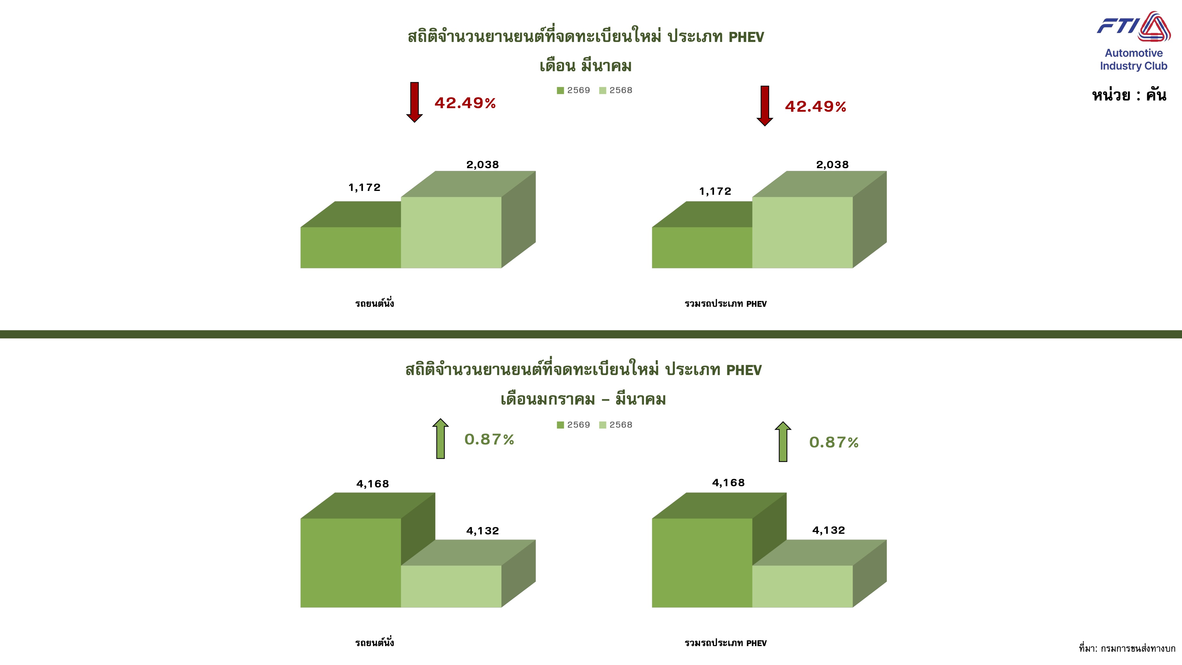 เดือนมกราคม - มีนาคม 2569 มียานยนต์ประเภทไฟฟ้า (PHEV) จดทะเบียนใหม่สะสมมีจำนวน 4,168 คัน เพิ่มขึ้นจากเดือนมกราคม - มีนาคมปีที่แล้วร้อยละ 0.87 โดยแบ่งเป็น