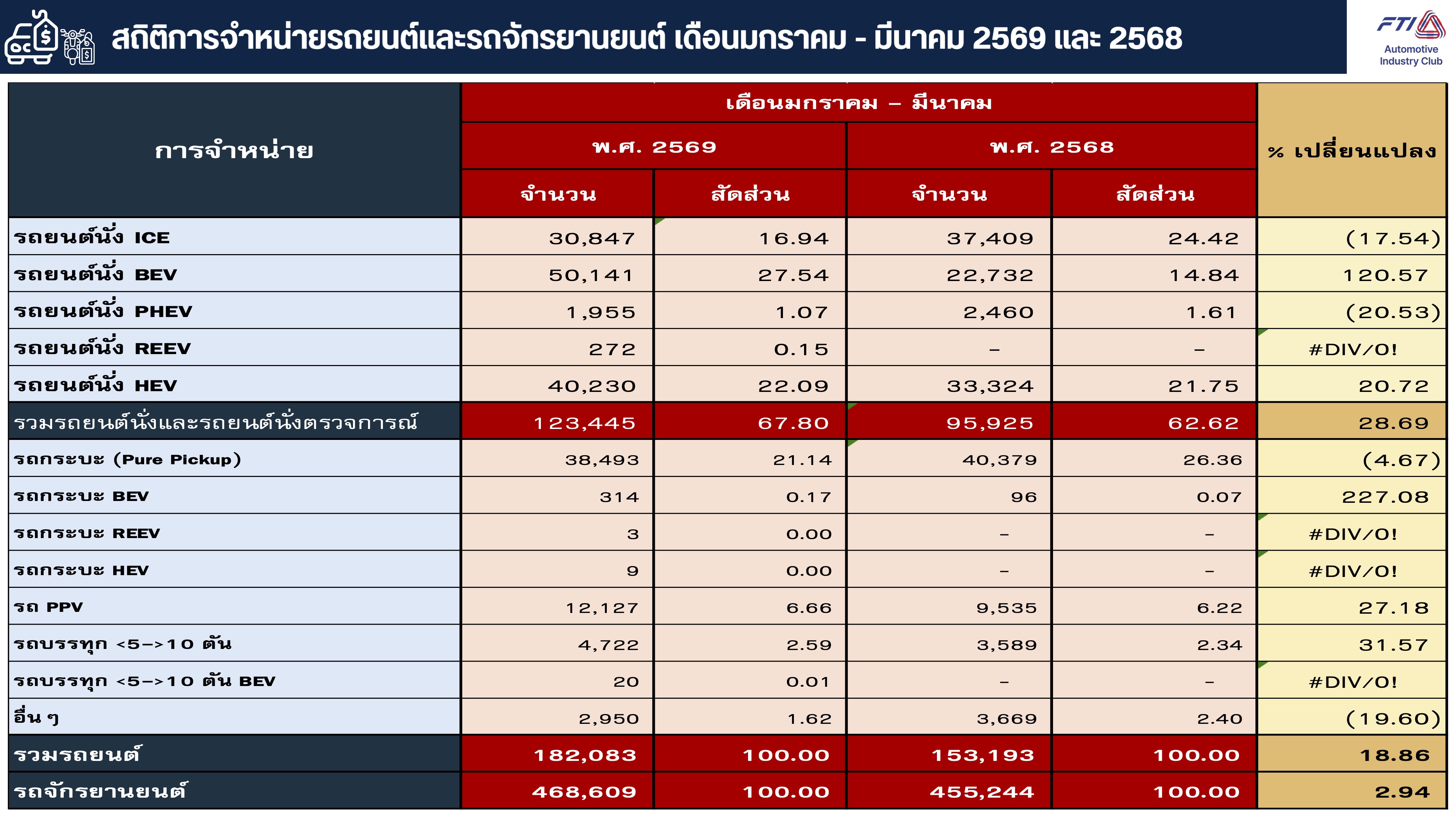 ตั้งแต่เดือนมกราคม - มีนาคม 2569 รถยนต์มียอดขาย 182,083 คัน เพิ่มขึ้นจากปี 2568 ร้อยละ 18.86 แยกเป็น