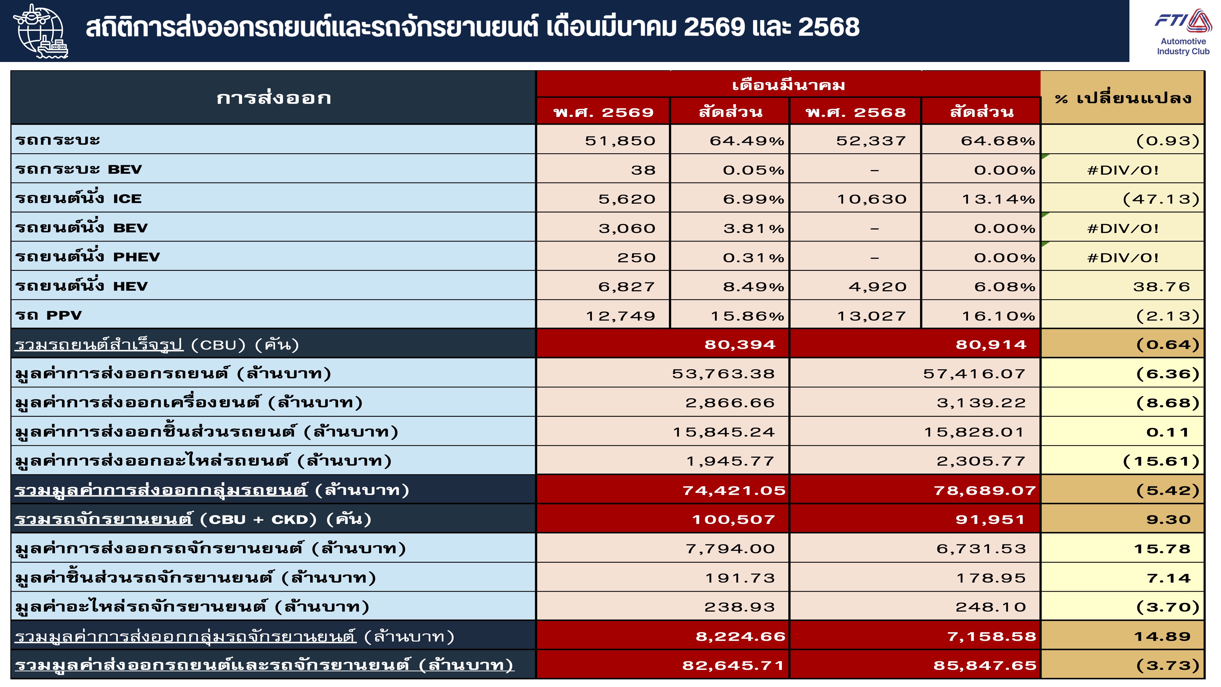 รวมมูลค่าส่งออกรถยนต์เดือนมีนาคม 2569 เครื่องยนต์ ชิ้นส่วนรถยนต์ และอะไหล่ มีมูลค่า 74,421.05ล้านบาท ลดลงจากเดือนมีนาคม 2568 ร้อยละ 5.42